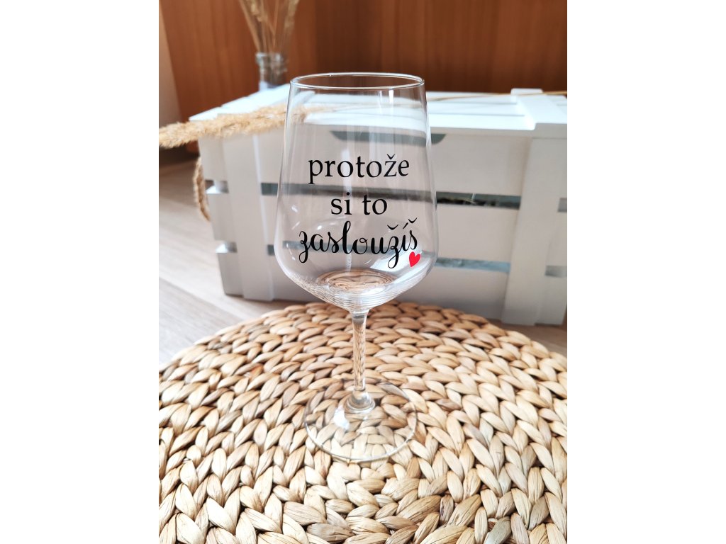 Sklenička na víno s unikátním vinylovým polepem "protože si to zasloužíš" je originálním dárkem a skvělým parťákem pro odměnu po náročném dni.