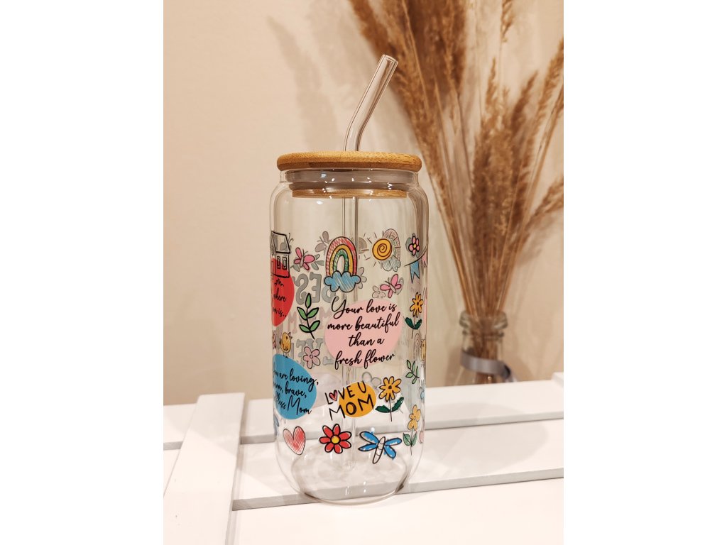 Sklenice s polepem "Best mom ever" včetně bambusového víčka a skleněného brčka.