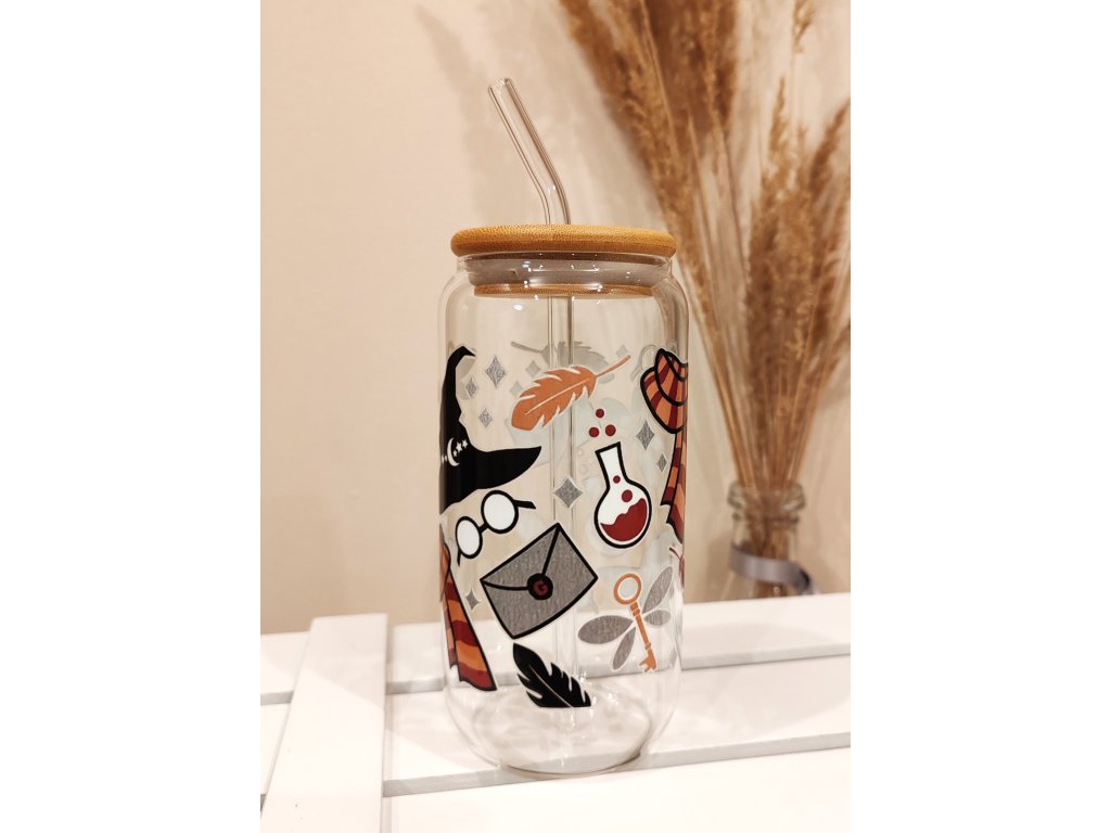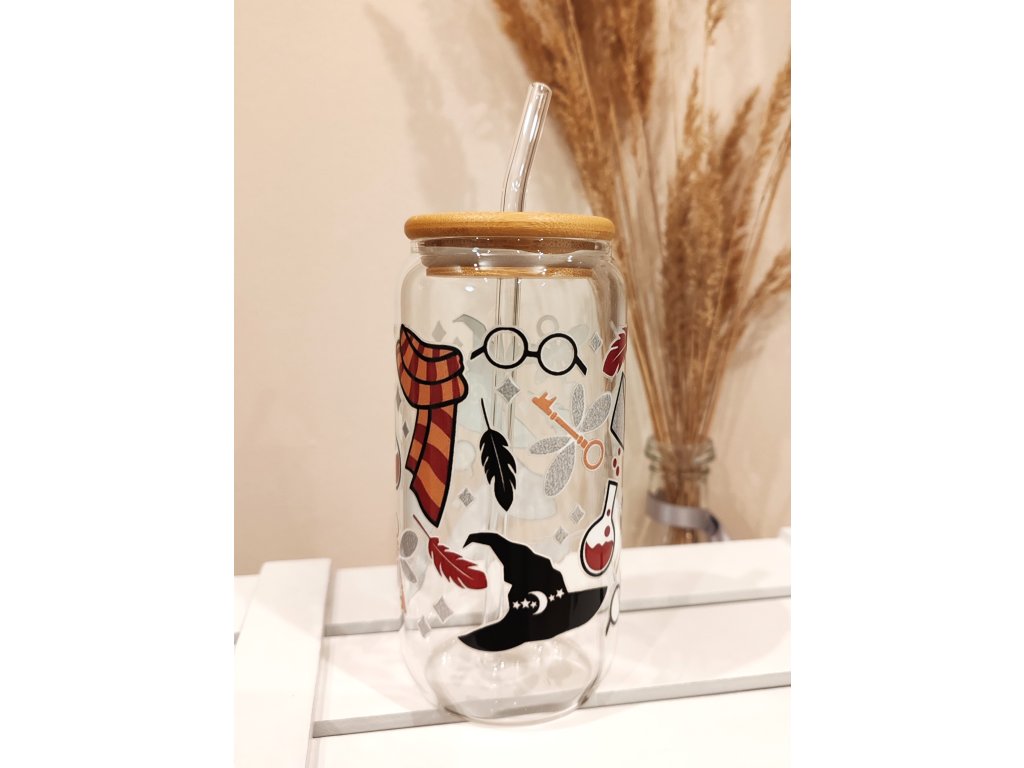 Sklenice s polepem "Harry Potter" včetně bambusového víčka a skleněného brčka.