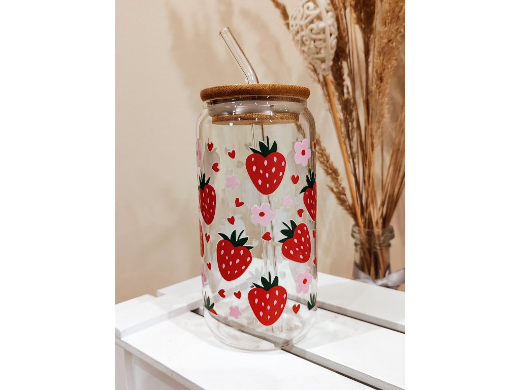 Sklenice s polepem jahod včetně bambusového víčka a skleněného brčka.