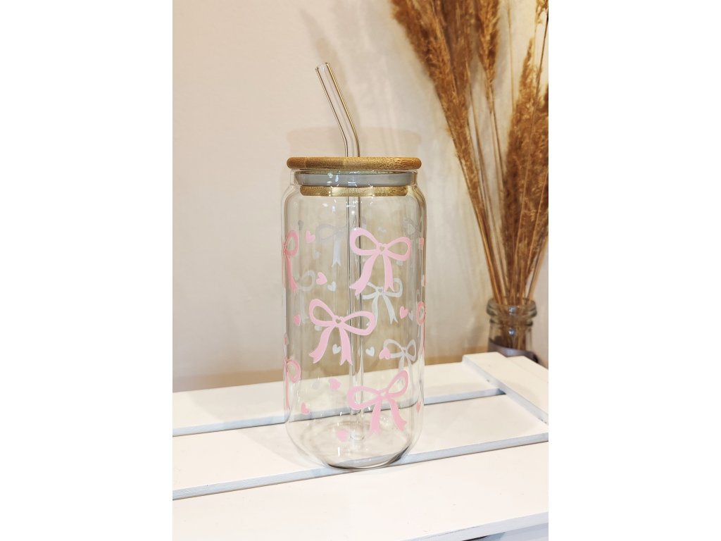 Sklenice s polepem mašličky včetně bambusového víčka a skleněného brčka.