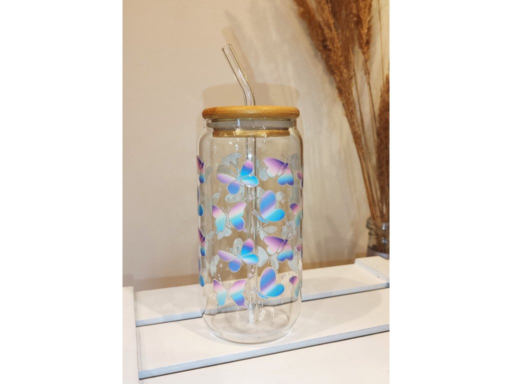 Sklenice s polepem motýlci včetně bambusového víčka a skleněného brčka.
