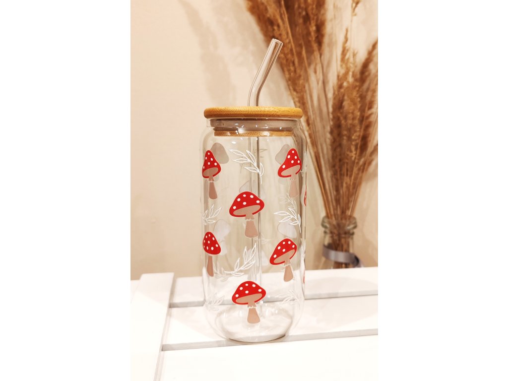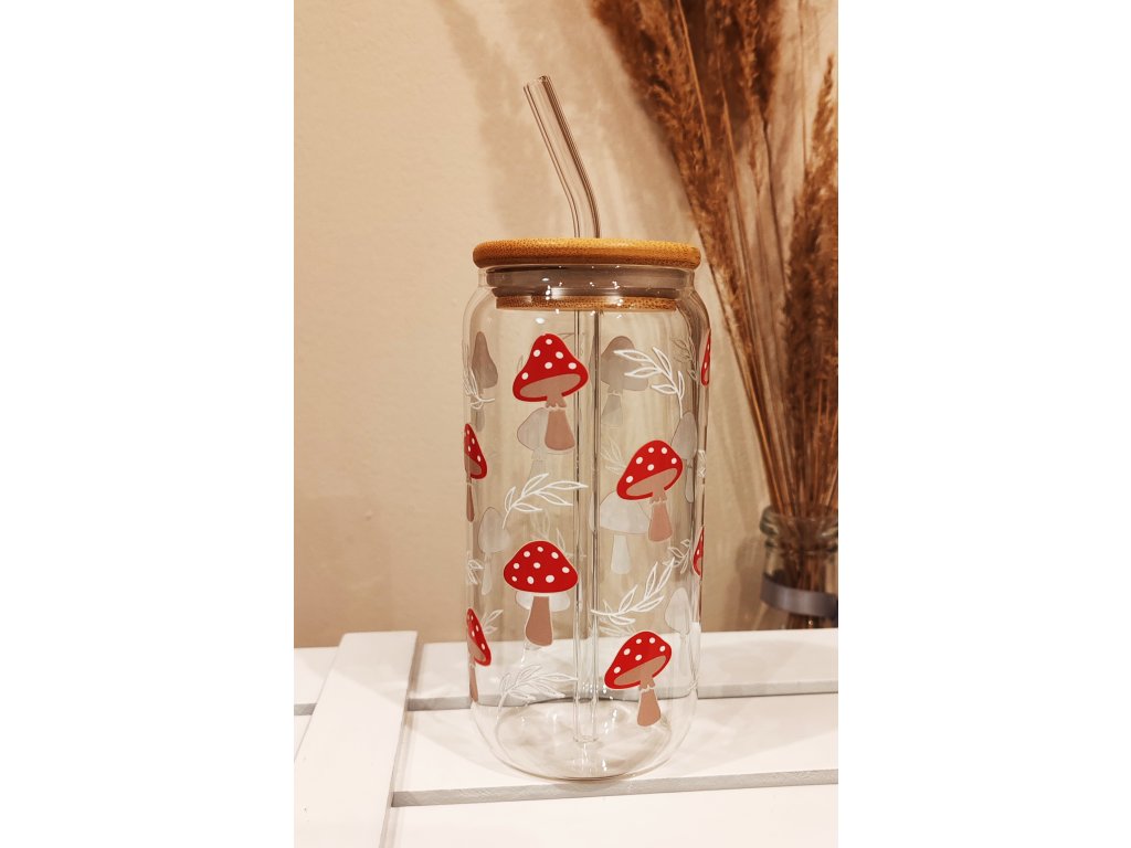 Sklenice s polepem muchomůrky včetně bambusového víčka a skleněného brčka.