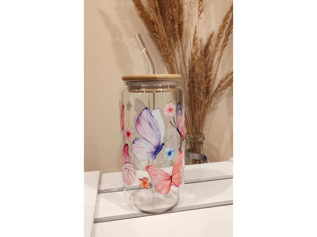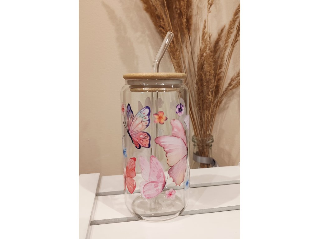 Sklenice s polepem motýlci včetně bambusového víčka a skleněného brčka.