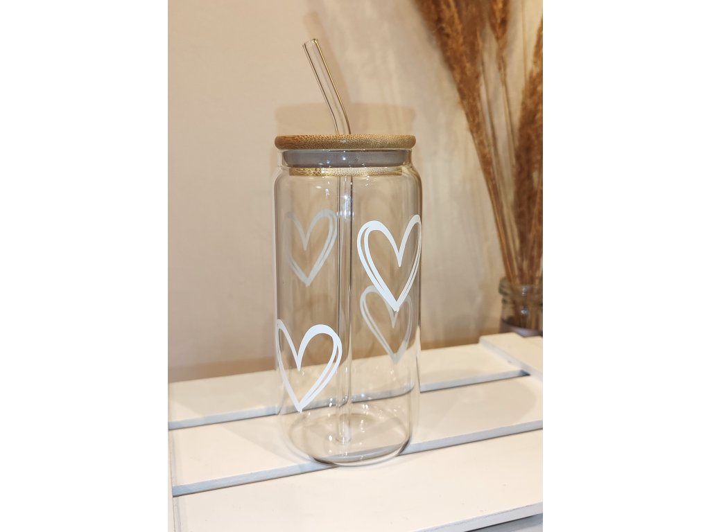 Sklenice s polepem srdce včetně bambusového víčka a skleněného brčka.