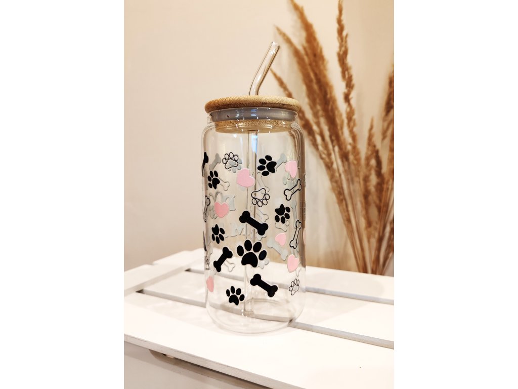 Sklenice s polepem pro pejskaře včetně bambusového víčka a skleněného brčka.