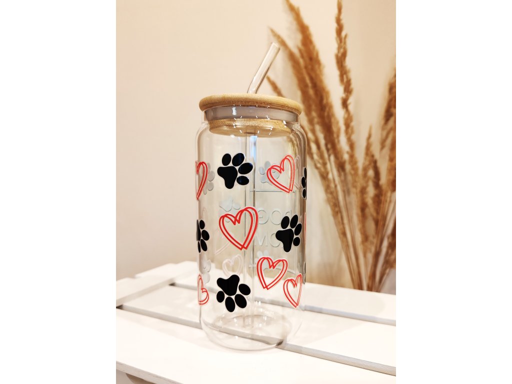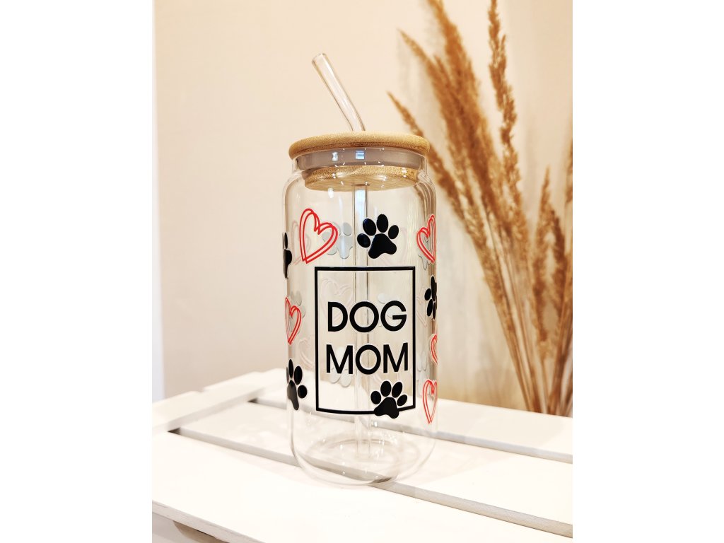 Sklenice s polepem pro pejskaře včetně bambusového víčka a skleněného brčka.