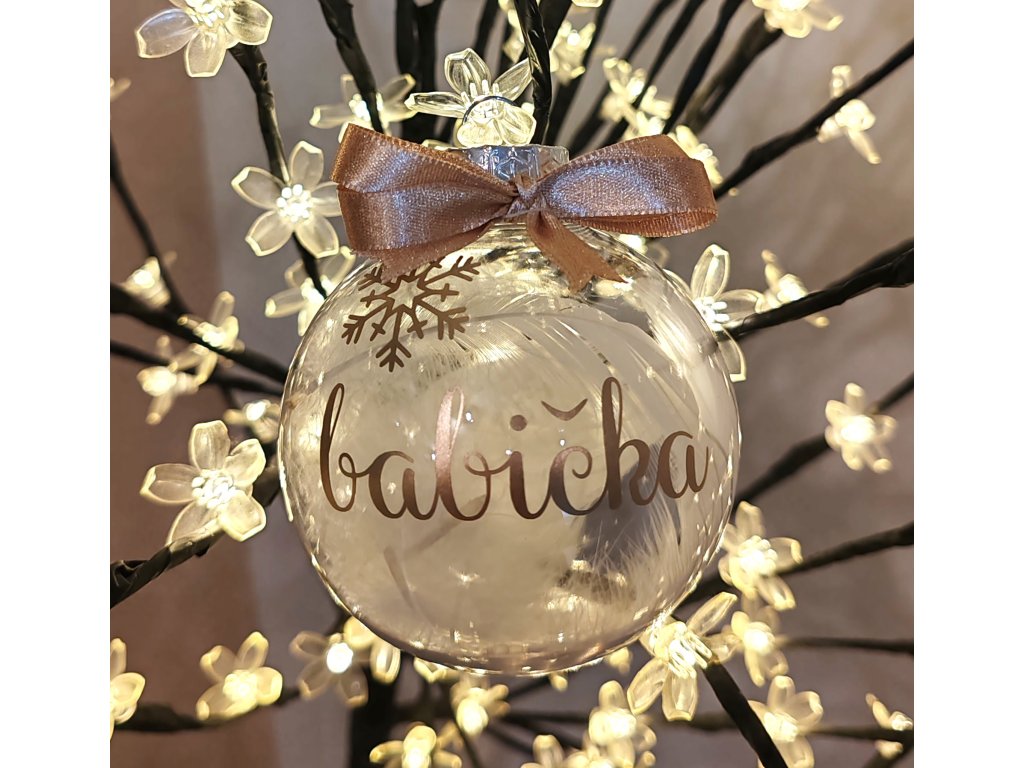 Vánoční ozdoba se zlatým nápisem "babička" a vločkou je plněná bílým peřím.