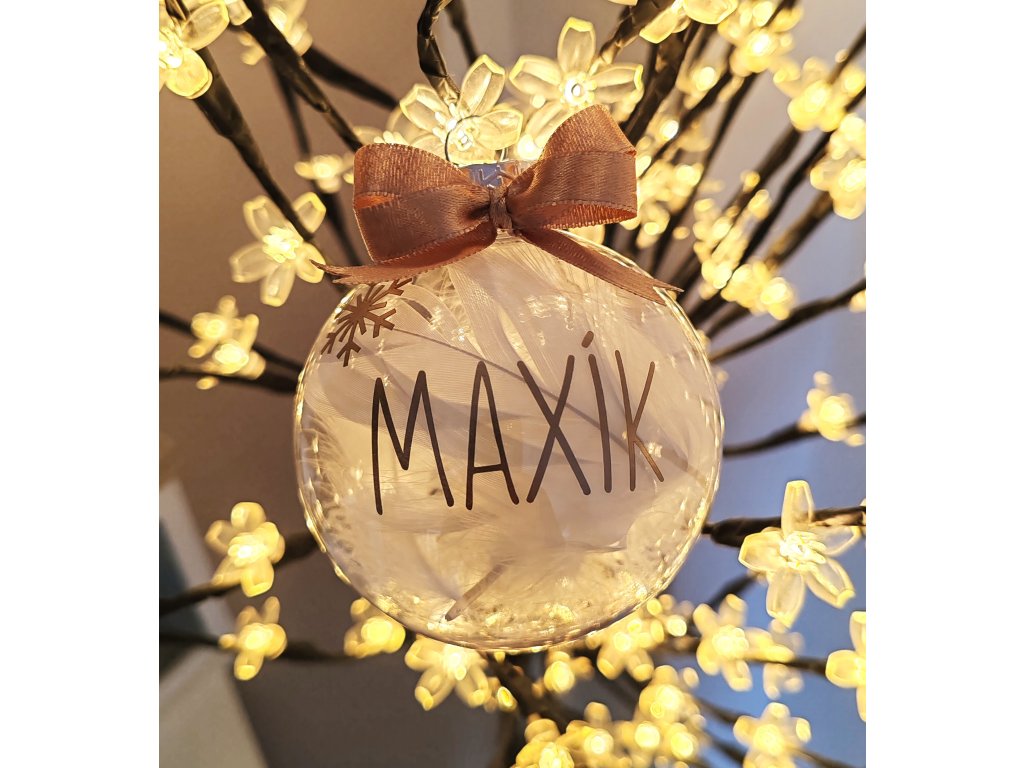 Vánoční ozdoba s pírky, zlatým tiskacím nápisem na přání, vločkou a hnědou mašličkou. Do poznámky prosím uveďte jméno, které se má na vánoční ozdobě objevit.